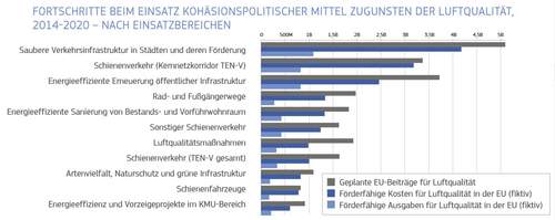 Die europäischen Regionen und die Mitgliedstaaten der EU erhalten über den Europäischen Fonds für regionale Entwicklung und den Kohäsionsfonds kohäsionspolitische Unterstützung bei ihren Bemühungen zur Umsetzung der europäischen Ziele für das Programm „Saubere Luft für Europa“, welches bis 2030 die Halbierung der gesundheitlichen Folgen der Luftverschmutzung vorsieht.